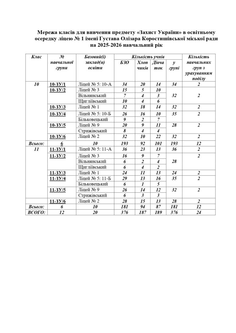 Наказ №150 Про організацію викладання навчального предмета “Захист України” на базі освітнього осередку ліцею у 2025-2026 н.р.