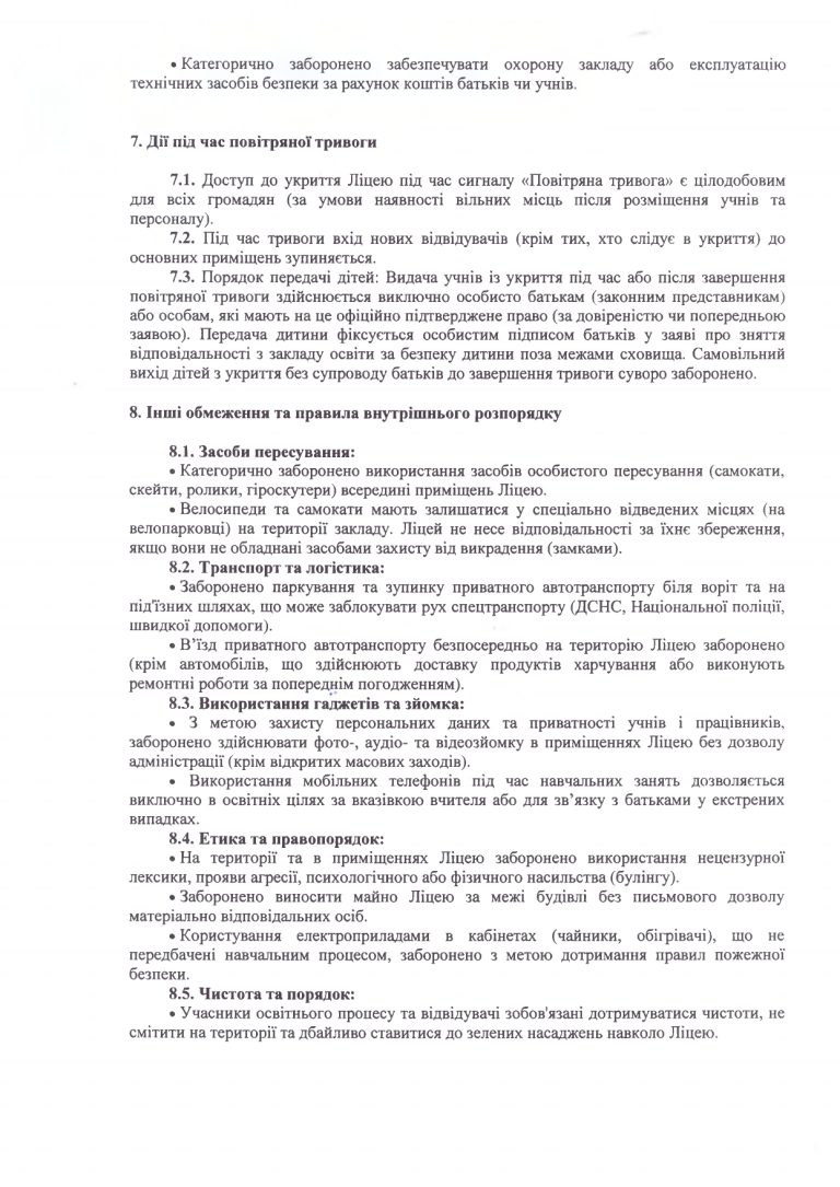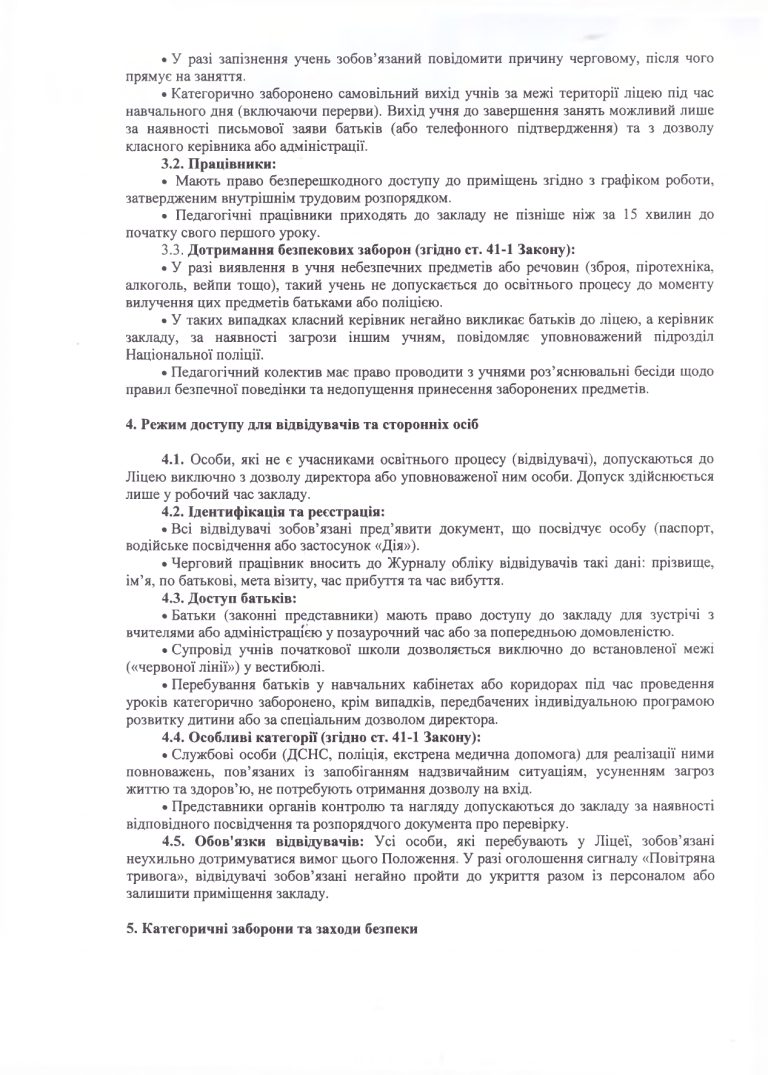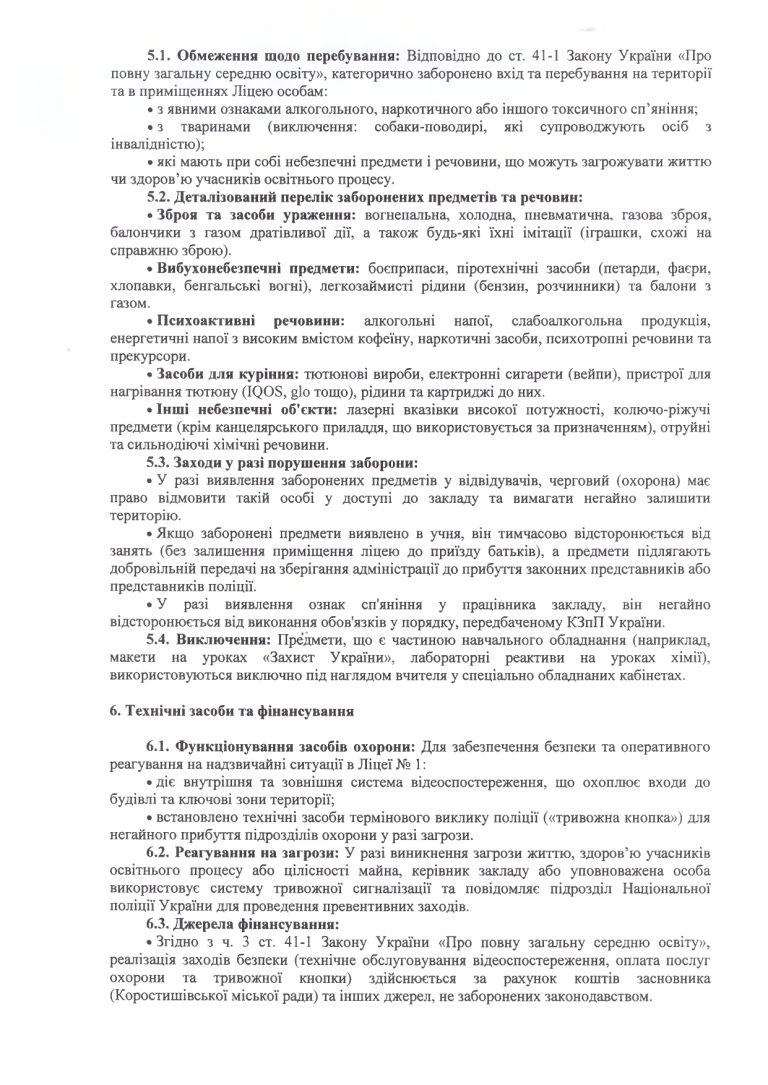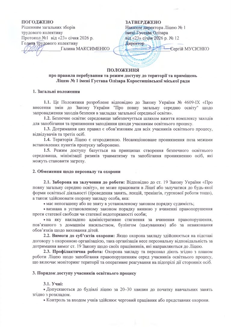 Положення про про правила перебування та режим доступу до території та приміщень Ліцею № 1 імені Густава Олізара Коростишівської міської ради